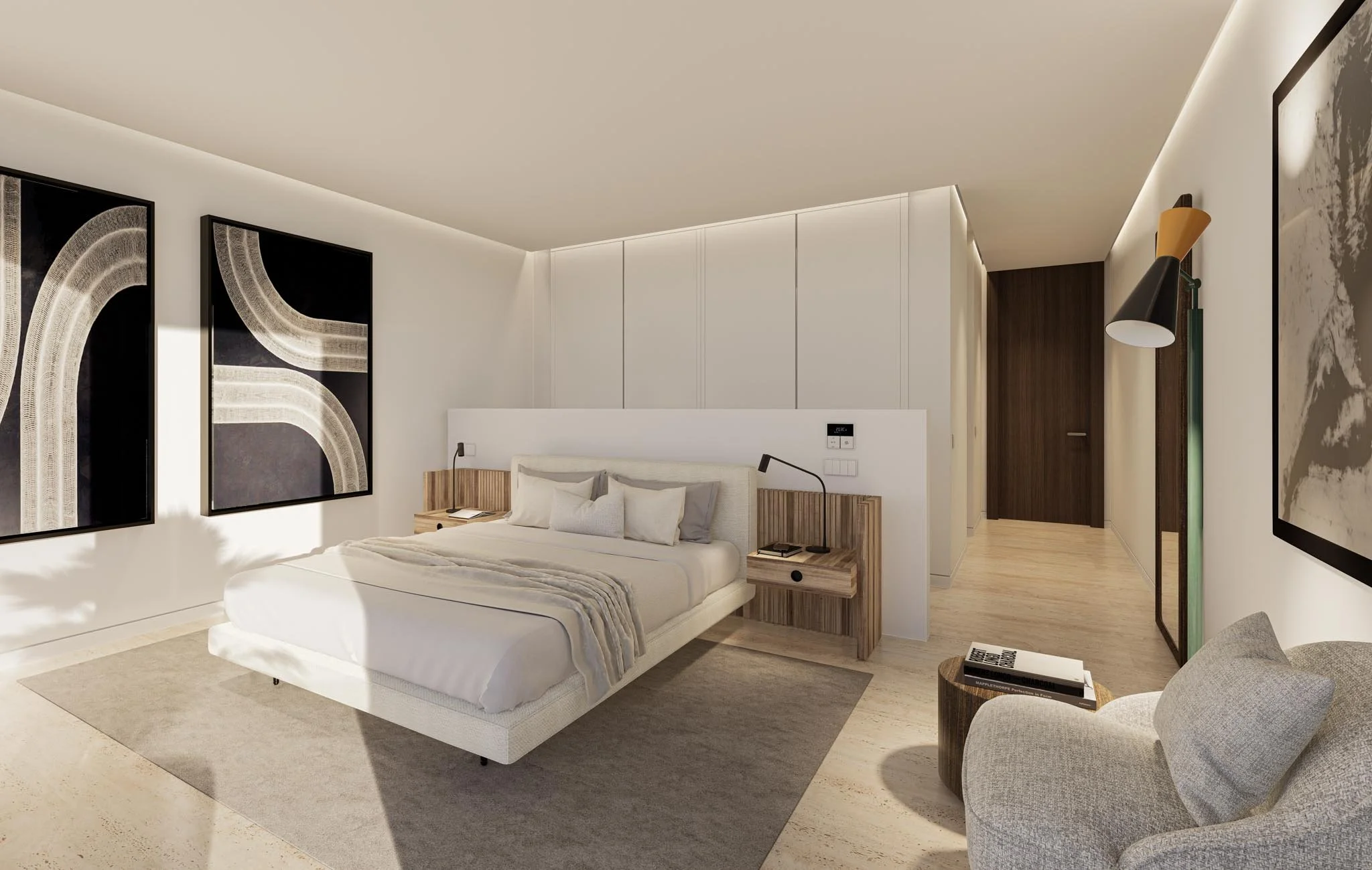 El acceso principal se encuentra en la planta baja donde conectamos con una zona de estar diáfana, una generosa cocina y comedor, así como un amplio lounge terrace que se funde con la piscina infinity encarada al horizonte.